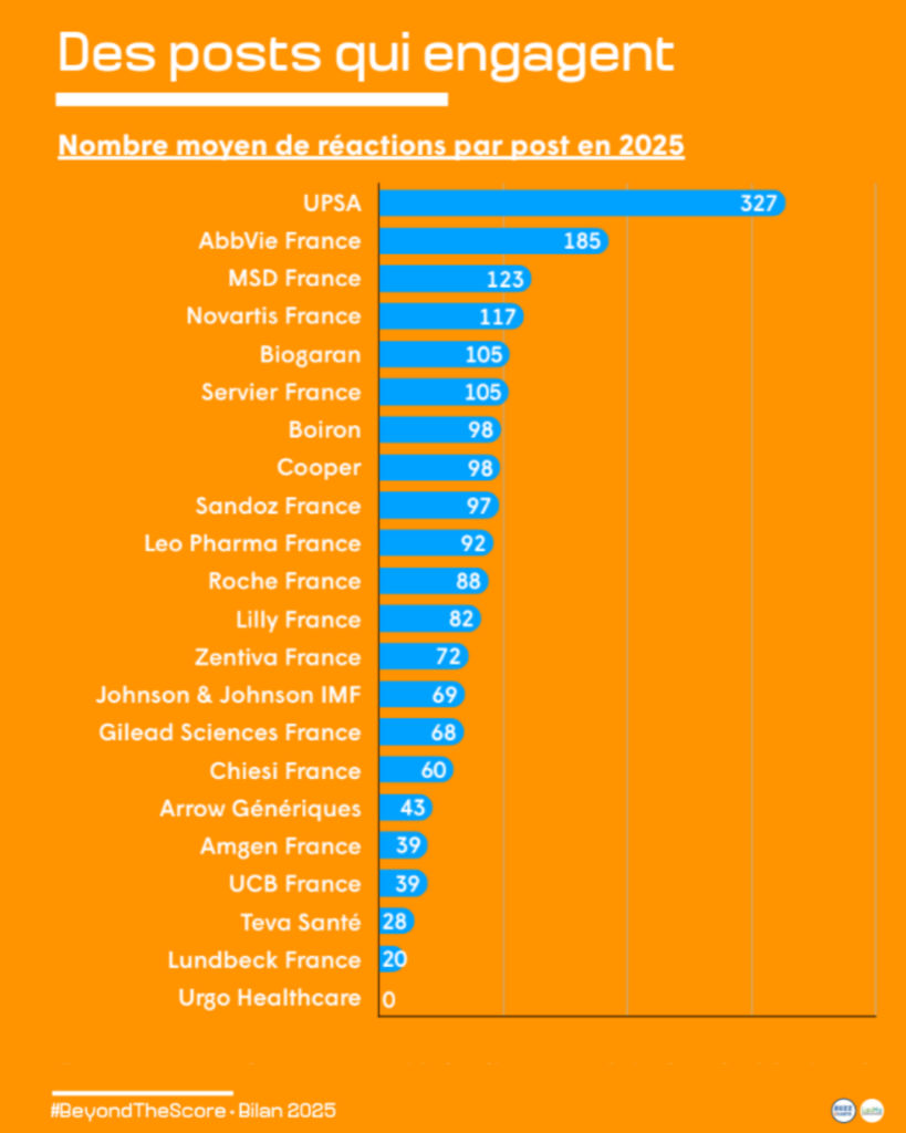 Les pages qui suscitent le plus de réactions sur 2025 sont UPSA, Abbvie France et MSD France. Passant de 1,30 % en 2024 à 3,20 % en 2025, le taux moyen mensuel de réactions par post est avant tout « dopé » avec l’entrée plus que réussit de la page AbbVie France dans le périmètre de suivi de #BeyondTheScore. Parmi les pages avec le taux moyen mensuel de réactions le plus élevé on retrouve Zentiva France, UCB France et Gliead Sciences France.