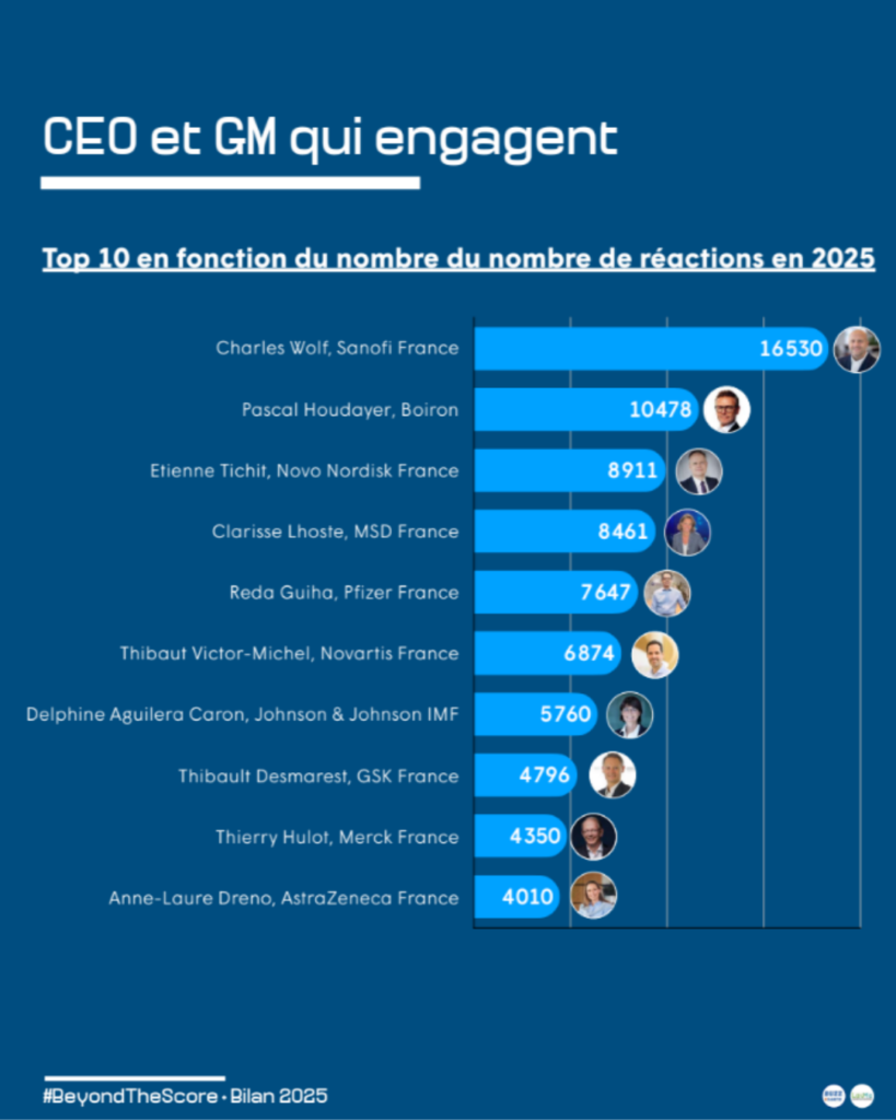 Au niveau de l’engagement, le top 10 en fonction du nombre de réactions reflète tout aussi bien le nombre d’abonnés que le volume et la régularité des publications. On retrouve en tête de ce classement Charles Wolf (Sanofi) suivi de Pascal Houdayer (Boiron) et Etienne Tichit (Novo Nordisk).
