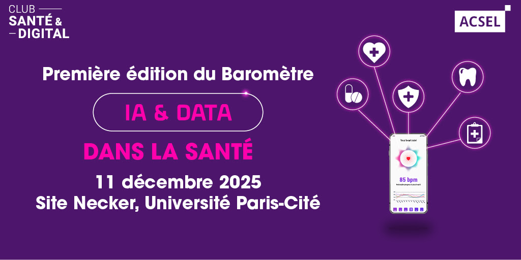 Le Club Santé & Digital de l’ACSEL propose une restitution de la première édition du baromètre data & IA en santé, l’étude la plus pointue sur la perception et l’adoption de l’Intelligence Artificielle en santé à la fois par les professionnels et par le grand public. Venez découvrir en exclusivité les résultats de cette étude miroir : l’impact des outils d’IA grand public dans le quotidien médical, les solutions qu’attendent vraiment les professionnels de santé, les freins qui bloquent l’innovation, les priorités d’investissement pour sécuriser le développement de ces outils…